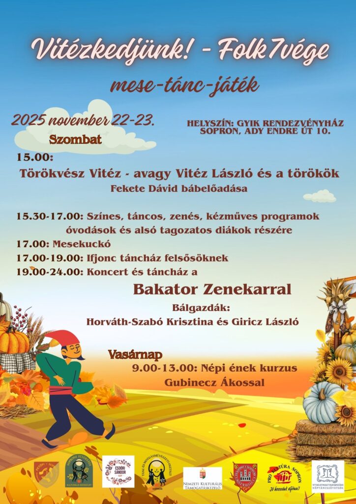 VITÉZKEDJÜNK! 2025. november 22-23-án Soproni Folk7vége a GYIK Rendezvényházban Sok szeretettel várunk Minden kedves érdeklődőt a délutáni bábelőadáson, foglalkoztatón, gyermek- és ifjúsági táncházban. Este a Bakator zenekar koncertje, utána táncház! A műsorban közreműködnek a Petőfi-iskola és a Pendelyes táncosai, énekesei, illetve az egykori tanítványainkból álló Nemez Banda. Sok szeretettel várunk minden kedves érdeklődőt! Minden jog […]