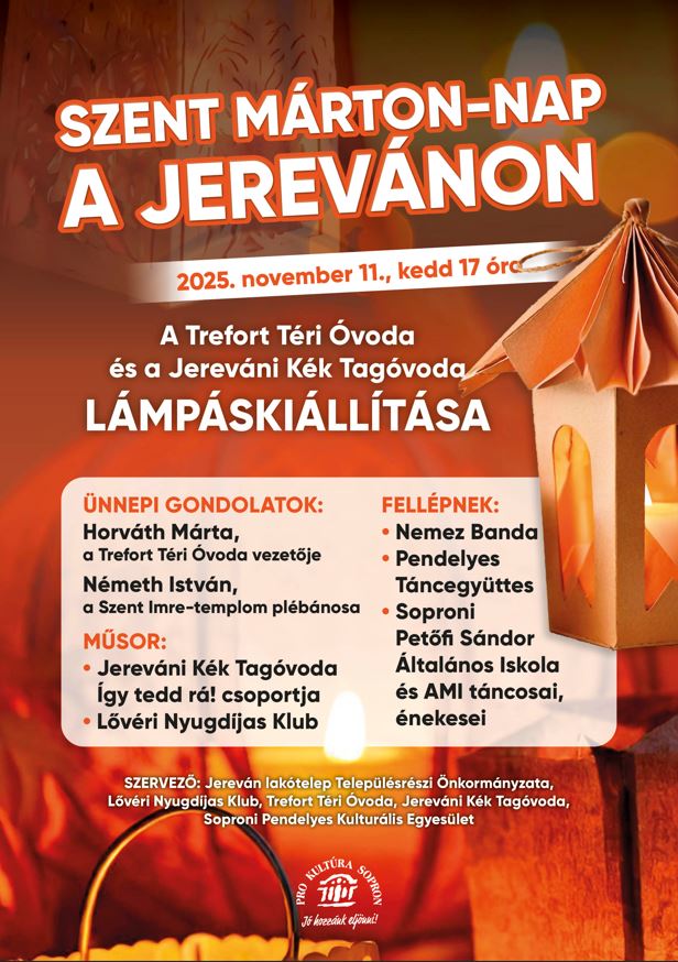 Szent Márton Nap a Jerevánon A műsorban közreműködnek a Petőfi-iskola és a Pendelyes táncosai, énekesei, illetve az egykori tanítványainkból álló Nemez Banda. Sok szeretettel várunk minden kedves érdeklődőt! Minden jog fenntartva © 2025 Soproni Pendelyes Kulturális Egyesület | Készítette: Schubert Dávid